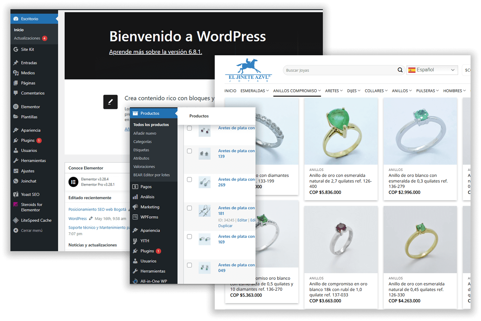 Con el complemento de WooCommerce de WordPress podeos desarrollar su tienda online este le permite revisar la información de sus clientes, pedidos, cupones y demás funciones con el análisis de ingresos y por medio de un constructor visual como elemntor podemos diseñar la parte visual de su página lo que ve el usuario.